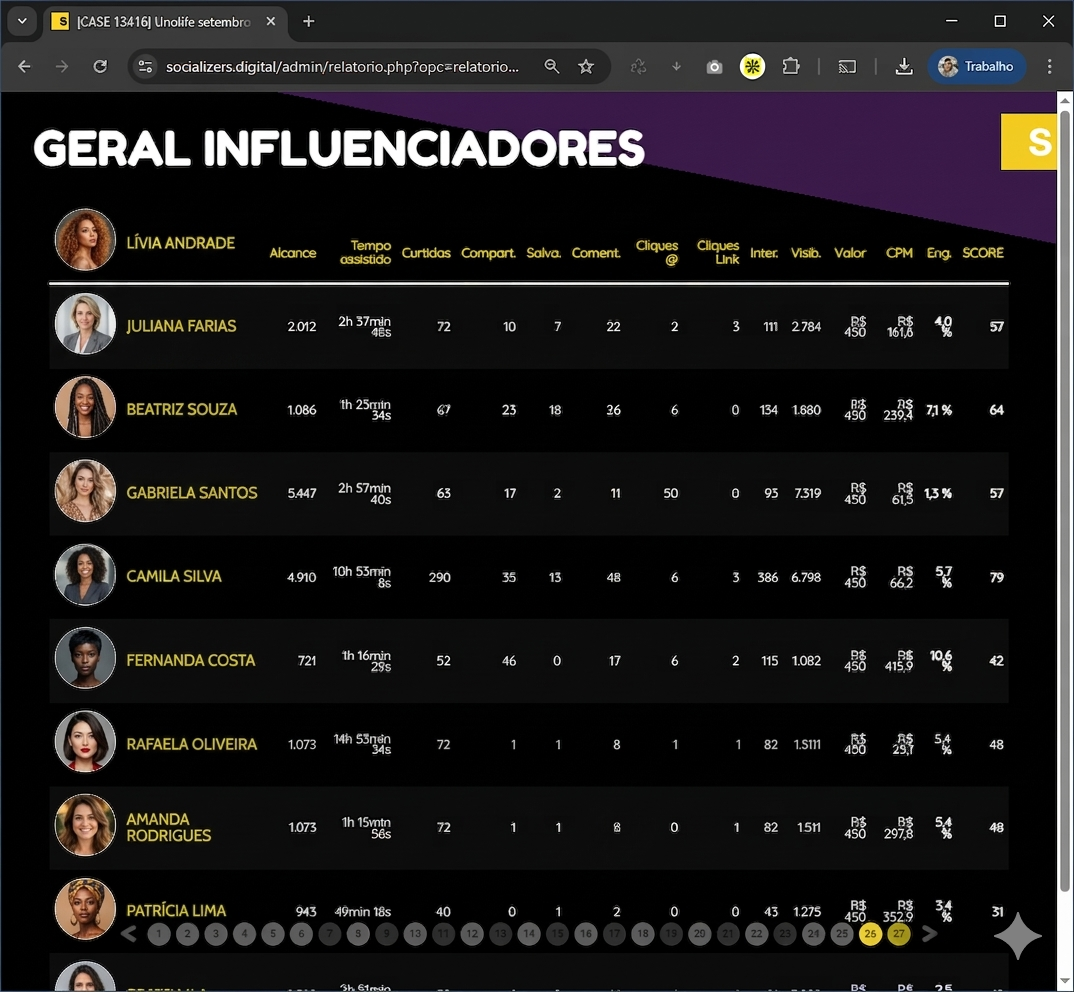 - Aceleração de Discovery: Otimizamos o tempo de seleção em até 70%, entregando uma lista qualificada pronta, eliminando perfis com audiência inativa ou “fake”.